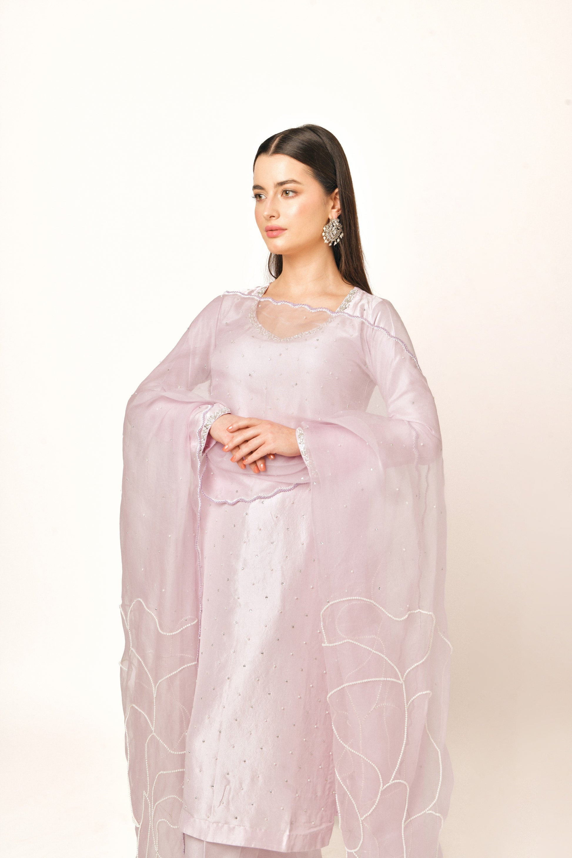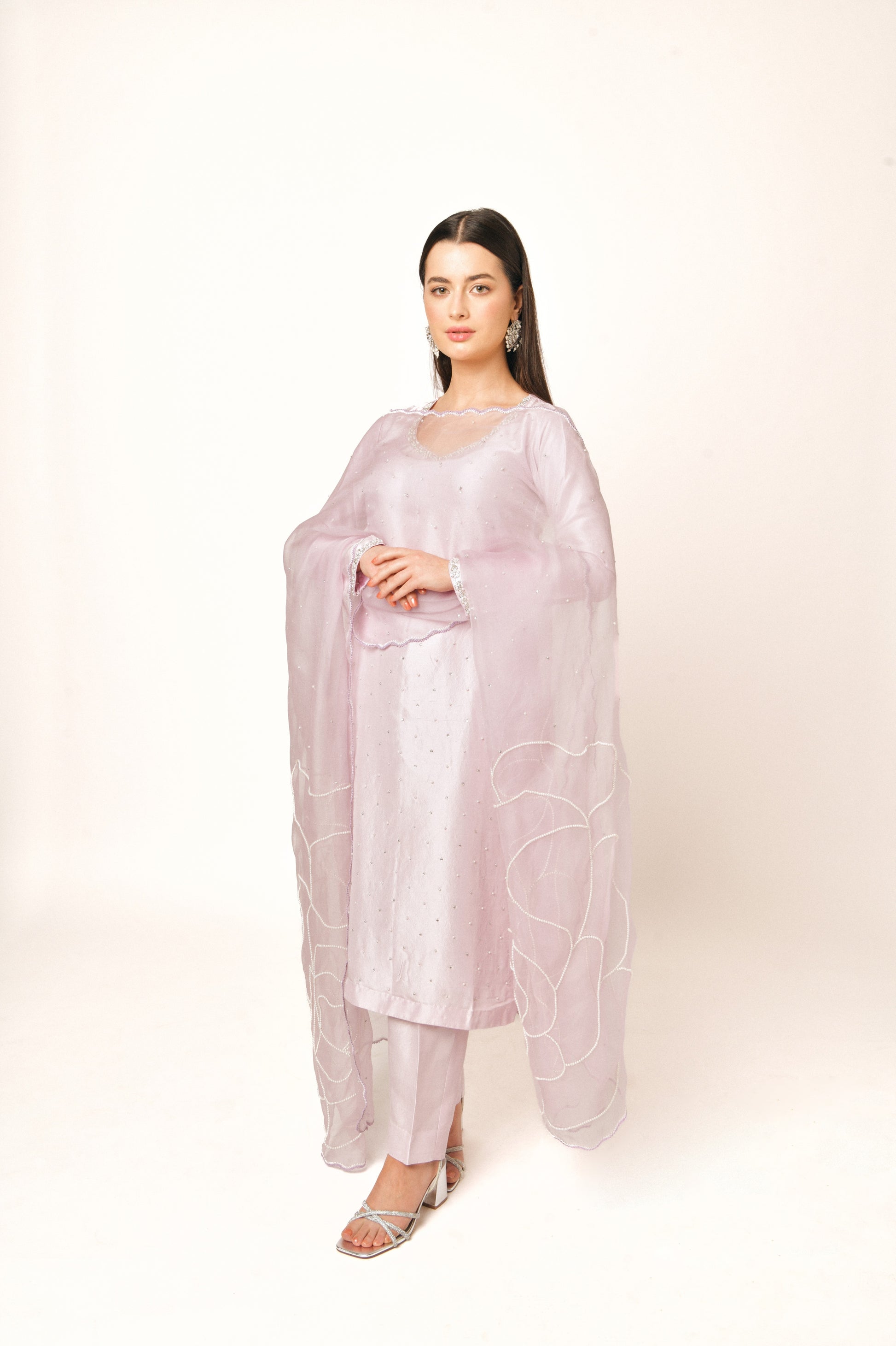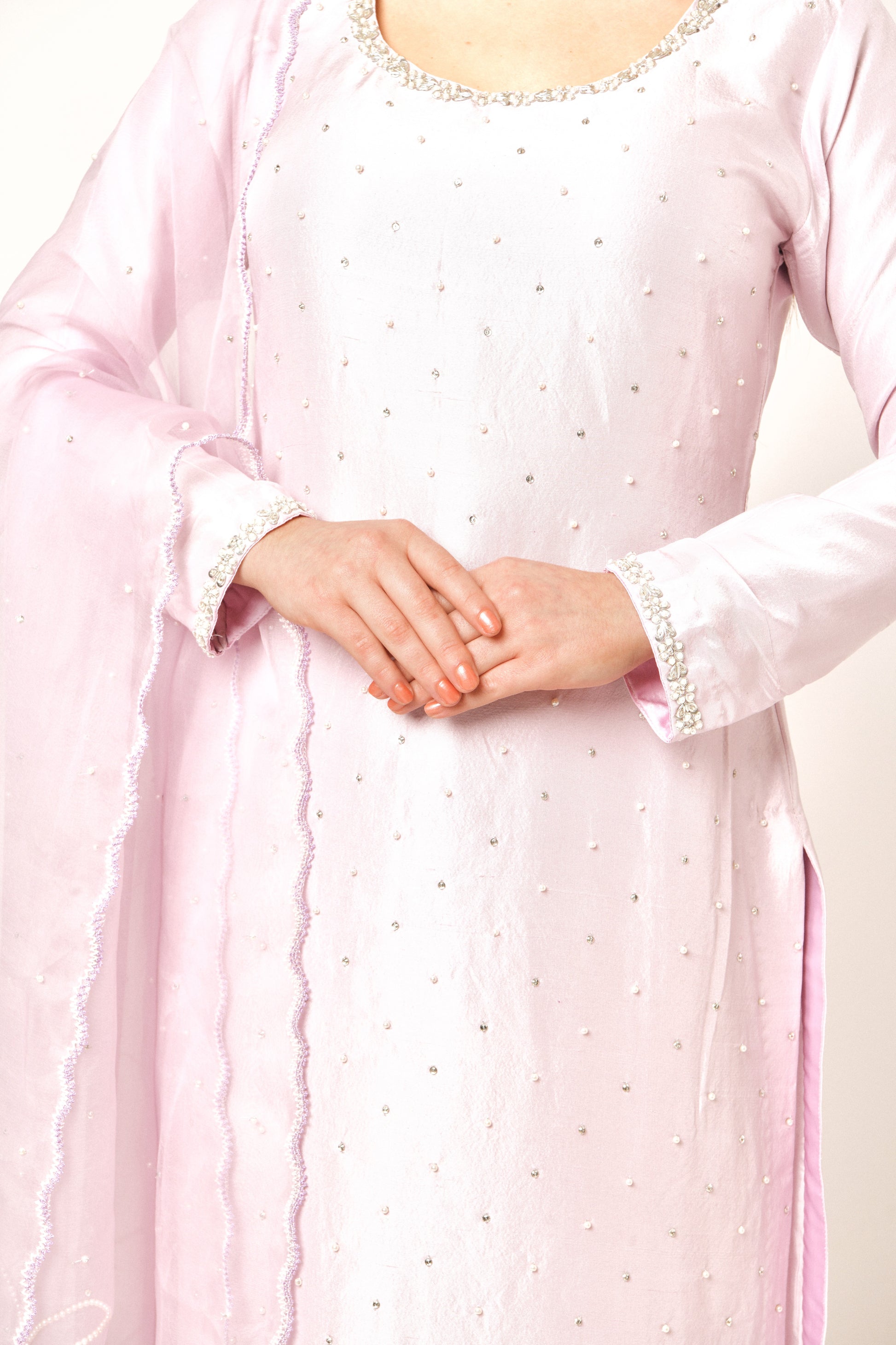 A luxurious raw silk straight kameez, adorned with silver embroidery at the neckline and cuffs, with a delicate spray of mini white pearls and silver gems for subtle radiance. Paired with a tailored raw silk trouser and a sheer organza dupatta, featuring floral details on each end, beautifully framed with silver embroidery.